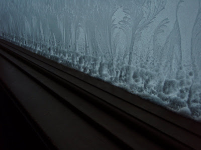 We decided to share the chill with everybody. This is a picture of the inside (yes inside) of our window in our bedroom. We ran the humidifier while we slept and it was super dooper cold out that night and this is a close up of the ice sculpture art that formed on the window. Pretty cool stuff eh?